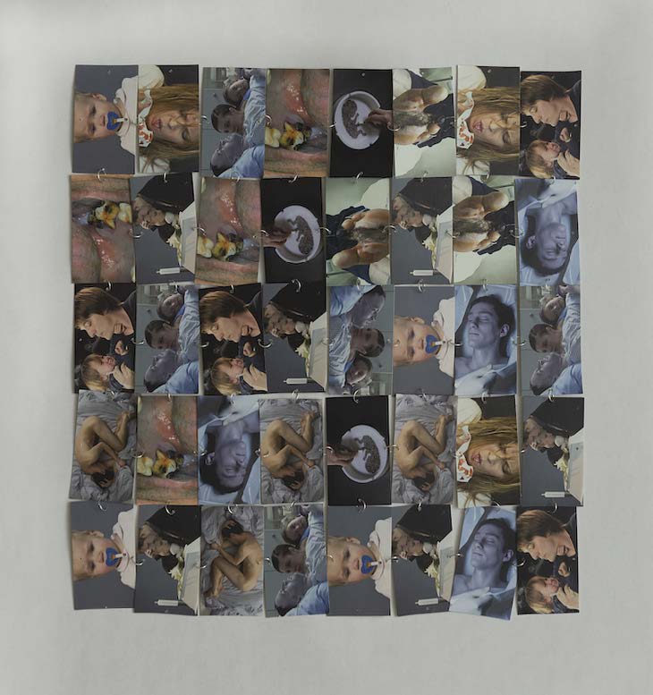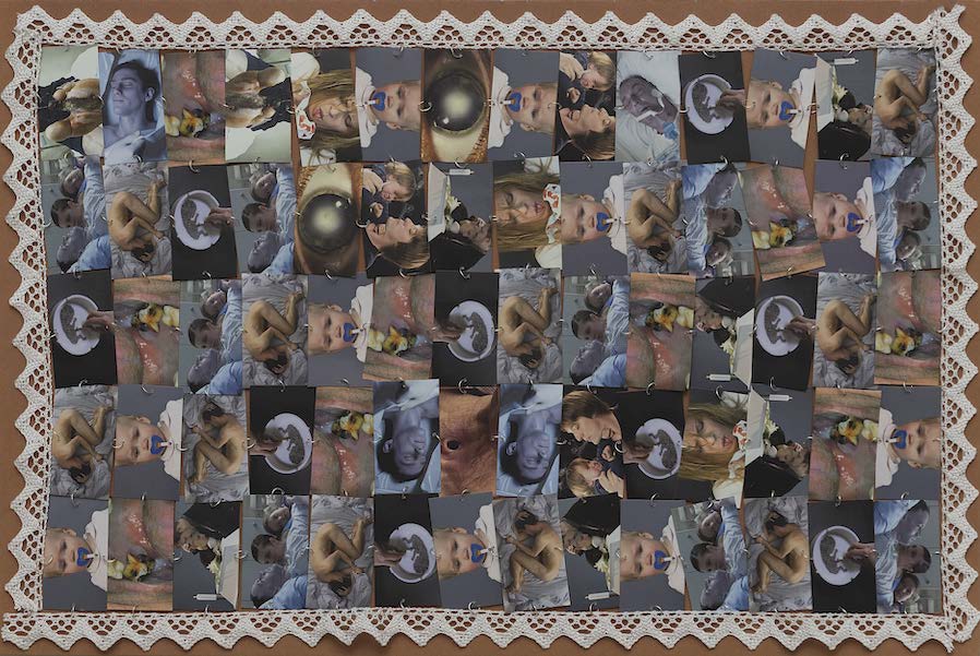 Decontestualizzate e spostate da un messaggio di propaganda aggressiva contro il fumo a uno di natura apparentemente più innocuo, le immagini che si trovano sui pacchetti di sigarette sono ricuciti tra loro dall’artista mediante anellini metallici per dar vita a una serie di tovagliette da colazione (o da pasto in generale) bordate di merletto o lasciate anche al loro stato crudo per creare un’atmosfera fatta di frammenti, sempre pronta a trasformarsi in assenza di dialogo, in notizia aggressiva e persuasiva, in sana e casalinga ironia.