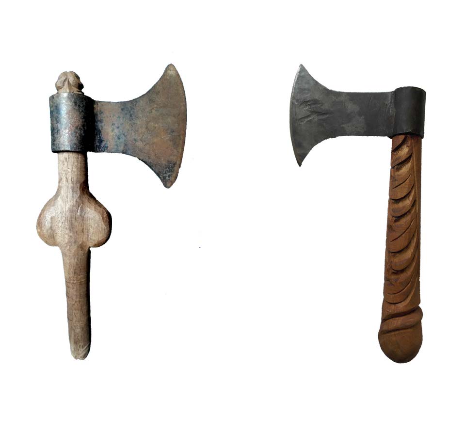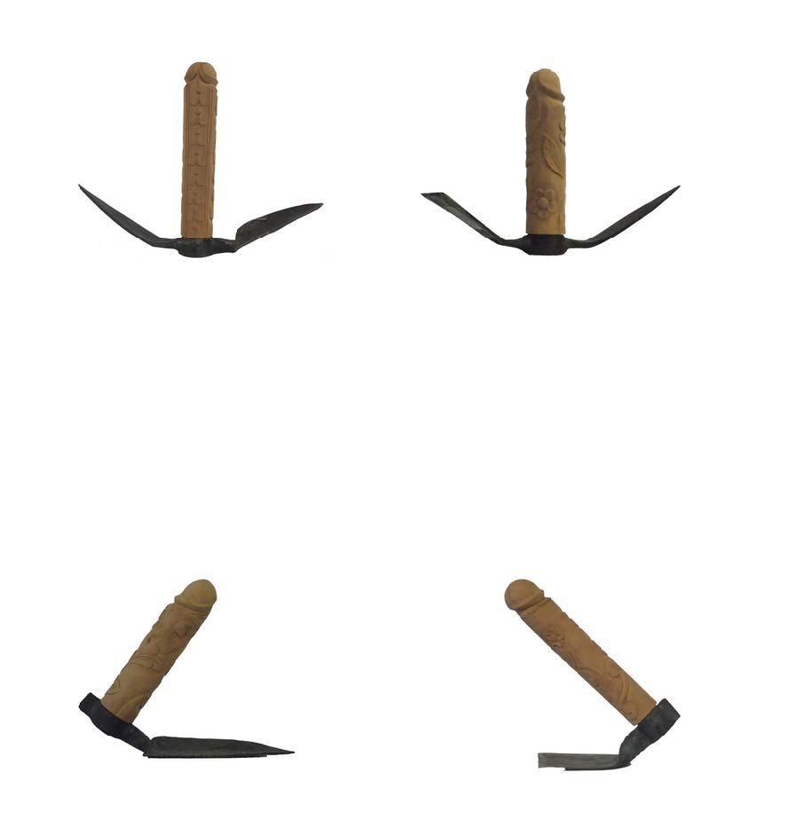 Impugnare un manico, ad esempio, è atto semplice, quasi primordiale, che introduce al lavoro manuale dello scavare, del zappare o del rastrellare. Ma l’atto dell’impugnare può anche spingersi verso la carne ed essere strumento di piacere o di esplorazione del corpo, proprio o altrui. Che cosa accade quando queste alternative si confondono o si sovrappongono e generano ambiguità, equivoco? Strumenti semplici di lavoro nei campi acquisiscono manici di legno intagliato che richiamano le colonne delle missioni gesuitiche in America del Sud (culture in legno delle Missioni Gesuiti nella Chiquitania di Bolivia), decorate a motivi barocchi meticci, ma che a una seconda o terza occhiata sono membri maschili.